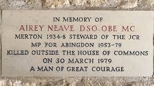 Airey Neave (1916-1979). Neave was the first officer to escape incarceration in Colditz and arrive back in the UK. On arrival home he was quickly recruited into MI9. After the war he entered politics and was assassinated by the Irish National Liberation Army (INLA) by a car bomb in the grounds of the Palace of Westminster.
